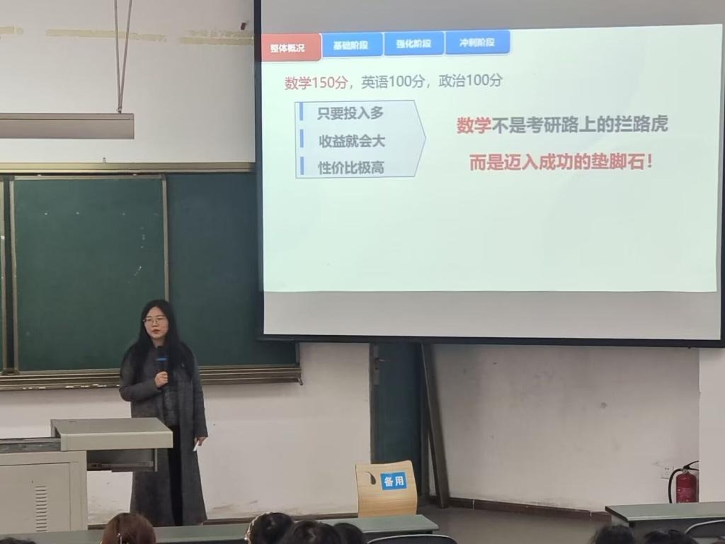 球盟会教师李宝平于12月8日在教学楼A208教室举办《考研交流——关于数学那些事儿》讲座。此次讲座旨在帮助同学们全面了解考研数学,提升数学成绩,更好地应对研究生入学考试,端正学习态度。