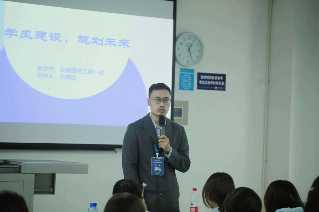 2023级生物医学工程本科一班、二班于9月21日在教学楼B102举行了专业思想班会,由专业负责人张婷老师、教研室主任陈涛老师,以及王光昶老师主讲。他们向同学们介绍了生工专业未来的发展方向,开展了新生入学适应引导,讲解了学习环境从高中到大学的转换。此外,一班班主任王立老师于10月25日开展了学业教育及学风建设班会,讲解了健康生活、目标规划、时间管理等方面的内容;二班班主任杨凡老师则于10月19日开展了学业教育及学风建设班会,强调了学风建设的具体事项内容,并要求班委进行工作总结。