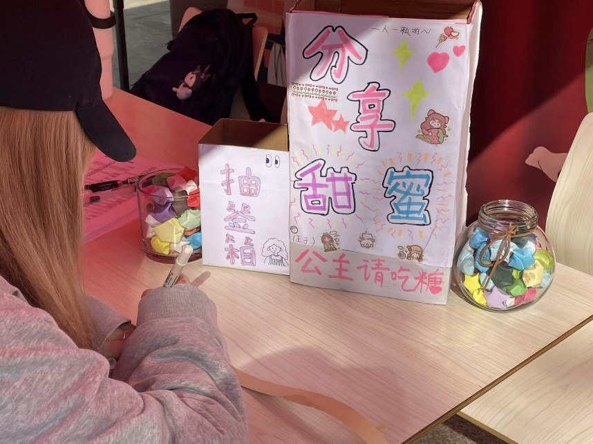 活动期间,同学们将自己的寄语写于纸上,并折成星星放入收集瓶中。参与活动的刘小梅同学说:“很开心能参与这次活动,现场的气氛很好,星星寄语的方式也很温暖。”王鹏飞同学说:“通过这次活动学会了折星星,并且将寄语写在纸上也是一个治愈的过程,也感觉无形之中向更多人传递了温暖。”何爱卿同学说:“感觉同学们每一次将星星投进瓶中,就是温暖的投递,瓶子里的星星越来越多,温暖的力量也越来越大。”
