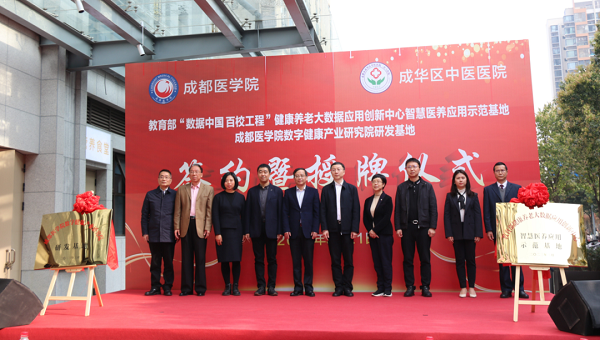 潘克俭董事长和张涛副董事长代表球盟会官网入口与成都市成华区委宣传部马亚炜部长、成都市成华区卫健局何梅局长一起将教育部“数据中国 百校工程”健康养老大数据应用创新中心智慧医养应用示范基地、球盟会官网入口数字健康产业研究院研发基地的牌匾授予成华区中医院。